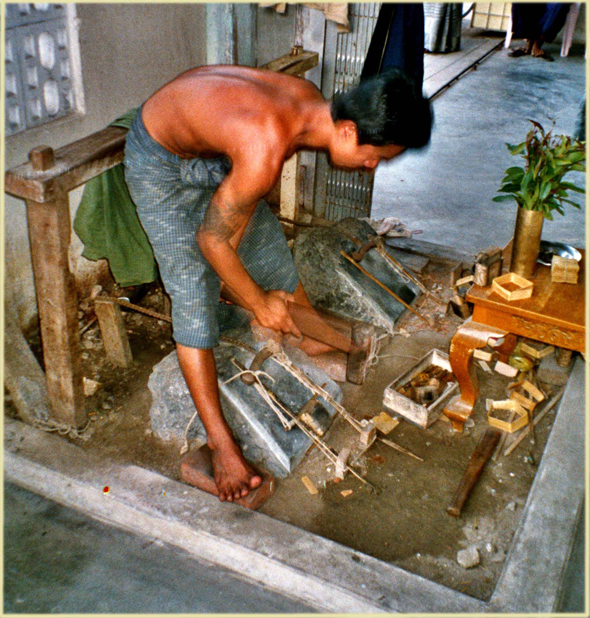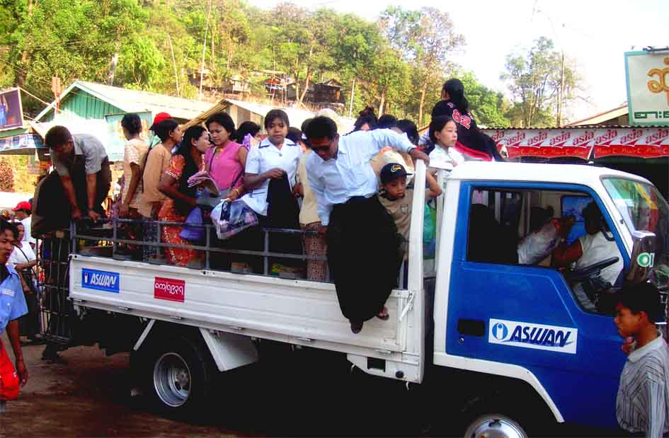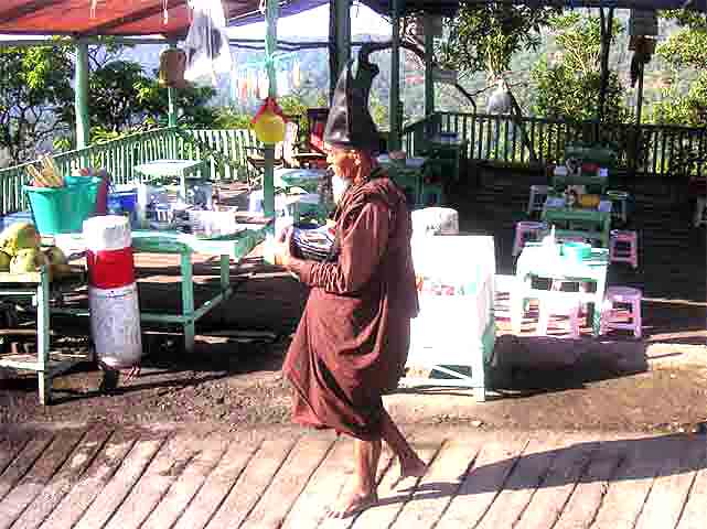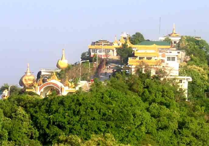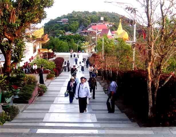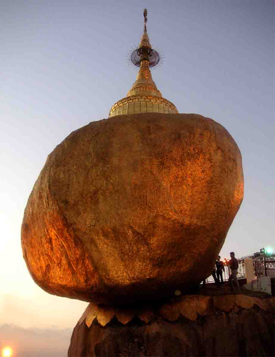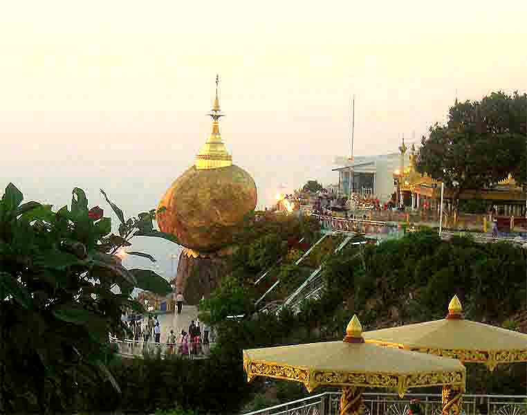(1200m) wird durch die Anfahrt von mehr als 600 Höhenmeter erleichtert.... Der Sonnenuntergang stellt mit dem weiten Ausblick in die Dschungelberge (Martabanberge) und nach Westen bis an die Andamanensee, zusammen mit der ver vergoldeten Pagode, mit dem riesigen "überhängenden", ebenfalls vergoldeten Findling, ein einzigartiges Erlebnis dar! Der eindrucksvolle Aufstieg macht diesen Ausflug zu einem echten Gewinn! (Auch Gehbehinderte müssen dieser Pilgerstätte nicht ausweichen : diese werden von der LKW-Station in Sänften zum Gipfel getragen!) Myanmar