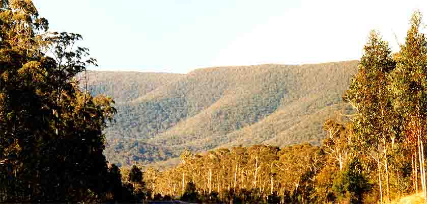 Range (ca. 1100 m ü.d.M.., im Hintergrund der Mt. Kosicusko 2230m,