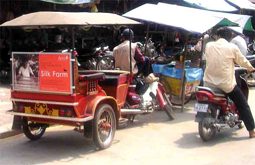 Das Hauptverkehrsmittel, als Taxi für kürzere Strecken, ist die "Mopedrikscha". Für die Bevölkerung das Moped: lange Sitzbank für die ganze Familie! (Gesetze bzw. Polizei gibt es scheinbar nicht, bzw. diese war auf der Straße nicht zu sehen).- |