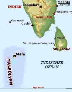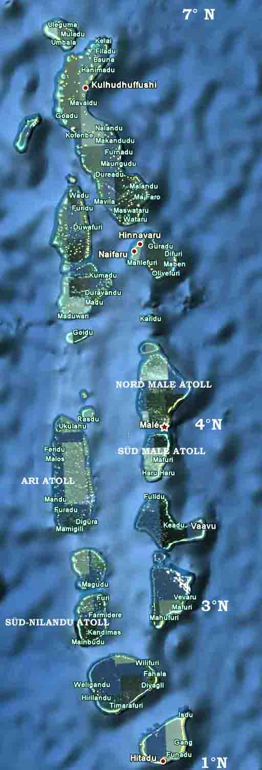 Meter vom Meeresboden erhebt ( die Lakadiven im Norden eine Velängerung , sowie im Süden die Tschagos Inseln) stellt ein einmaliges Korallensystem dar. Die ausserordentlich tiefen Meeresgräben zwischen den Atollen, machen diesen Inselstaat, gegenüber den größten Barriereriffen ( Great Barriere Reef - Australien, und dem mexikanischen Barierre Riff) einmalig! (Lage -> 7° Nord bis 1° Nord ) |